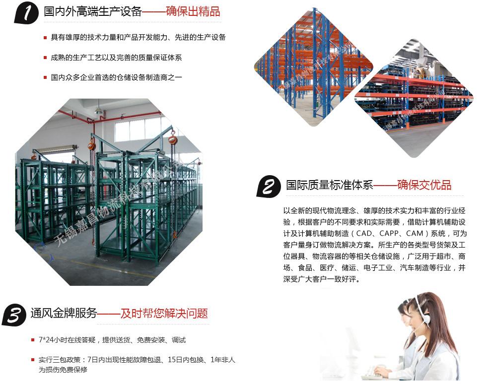 無(wú)錫嘉昌倉(cāng)儲(chǔ)貨架有限公司擁有多年的設(shè)計(jì)、生產(chǎn)、管理經(jīng)驗(yàn)。以全新的現(xiàn)代物流理念、雄厚的技術(shù)實(shí)力和豐富的行業(yè)經(jīng)驗(yàn),根據(jù)客戶的不同要求和實(shí)際需要,借助計(jì)算機(jī)輔助設(shè)計(jì)及計(jì)算機(jī)輔助制造(CAD、CAPP、CAM)系統(tǒng),可為客戶量身訂做物流解決方案。所生產(chǎn)的各類(lèi)型號(hào)貨架及工位器具、物流容器的等相關(guān)倉(cāng)儲(chǔ)設(shè)施,廣泛用于超市、商場(chǎng)、食品、醫(yī)療、儲(chǔ)運(yùn)、電子工業(yè)、汽車(chē)制造等行業(yè),并深受廣大客戶一致好評(píng)。